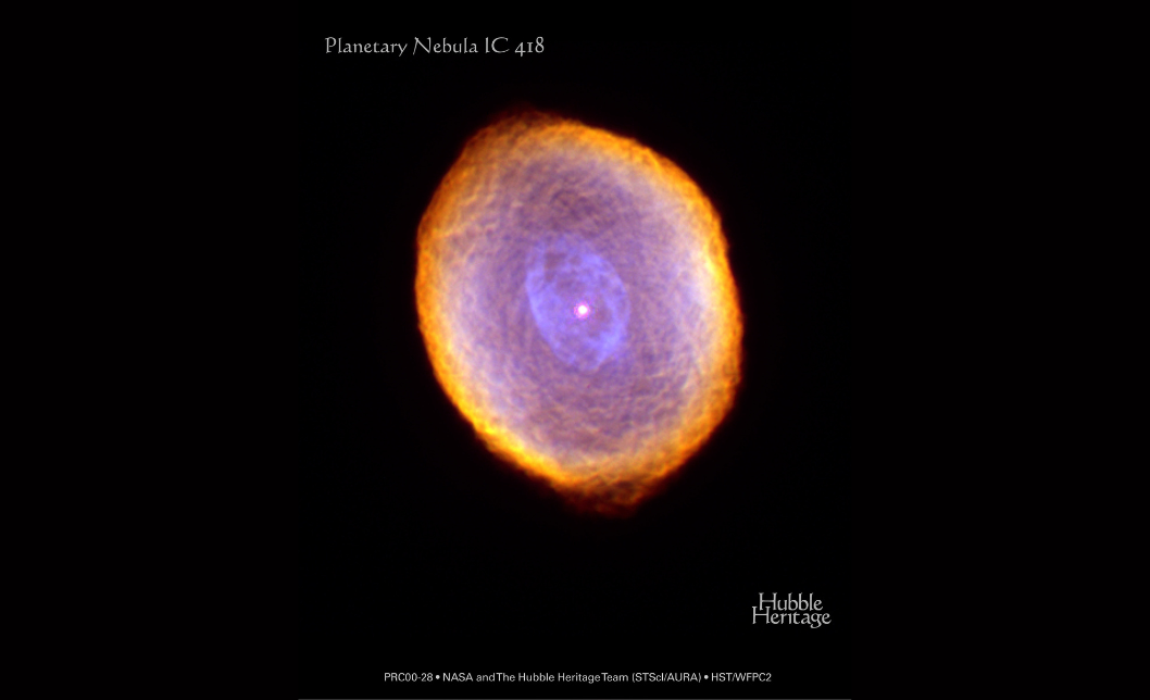 IC418是最早被发现的行星状星云之一,同时也是最明亮、最美丽且易于研究的星云之一。行星状星云是垂死恒星所抛出的发光外壳,由恒星在死亡前剧烈挣扎时喷出的气体组成,并受到残留恒星核心的激发与电离。 这一核心会在此过程中逐渐升温,最终演化成白矮星。白矮星的直径通常与地球相当,但质量约为太阳的0.6倍,因而呈现高温且极为致密的特性。由于核心收缩与升温导致的电离作用,使得抛出外壳中的氢、氧、氮和硫等元素,同时在光谱中产生狭窄的发射线。